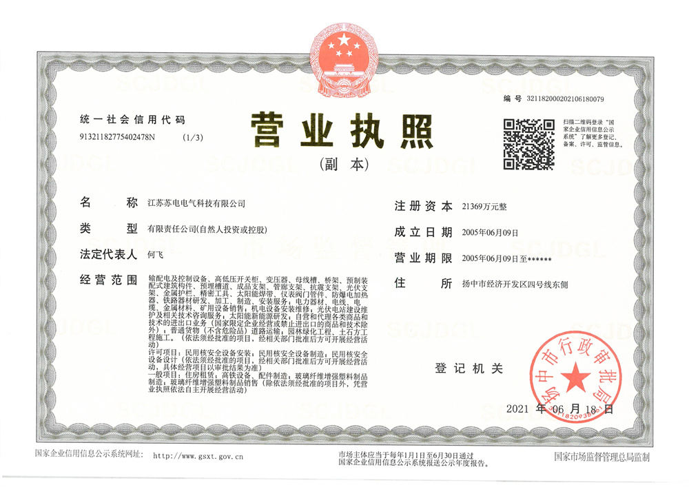 江蘇蘇電電氣科技有限公司是一家集制造、經(jīng)營(yíng)、服務(wù)于一體的綜合性企業(yè)。成立于2005年6月9日,注冊(cè)資金21369萬(wàn)元,現(xiàn)有職工186人,其中高級(jí)工程師3人 ,工程師15人,各類(lèi)專(zhuān)業(yè)技術(shù)人員28人,年銷(xiāo)售額3億多,是揚(yáng)中市開(kāi)發(fā)區(qū)三十強(qiáng)企業(yè)之一。 公司立足于電器領(lǐng)域,形成了多元化的發(fā)展格局。憑借優(yōu)秀的團(tuán)隊(duì)、精良的設(shè)備、優(yōu)勢(shì)的技術(shù)和高效的管理,專(zhuān)業(yè)生產(chǎn)高低壓開(kāi)關(guān)柜、母線(xiàn)槽、抗震支架、管廊支架、成品支架、光伏支架、電纜橋架等。在供配電、大型建筑、市政工程、光伏發(fā)電等領(lǐng)域享有較有高的聲譽(yù)。 公司始終秉承“求實(shí)、創(chuàng)新、和諧、共贏(yíng)”的發(fā)展主題,進(jìn)行了一系列變革,優(yōu)化資源配置,搭建了高效發(fā)展的平臺(tái)。公司較早地采用了CAD電腦輔助系統(tǒng),擁有數(shù)控加工中心。產(chǎn)品被青島新機(jī)場(chǎng)、江蘇省電力公司、湖北省電... ...